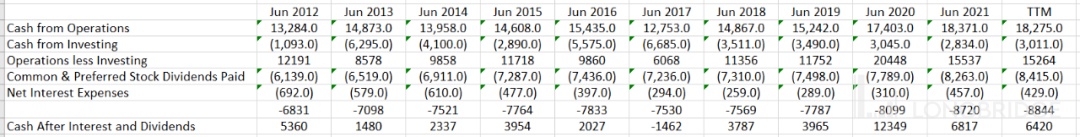 上表来自现金流量和损益表。第三行是公司在支付投资费用后从运营中获得 的现金金额。像 PG 这样规模的公司应该在这条线上有足够的现金,它确实如 此。将总股息和利息支付相加(从底部开始的第二行),并从操作减去投资 行中减去该总额。公司有足够的现金来支付债券和股东。
