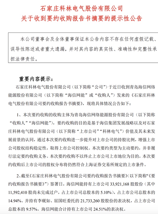 According to the announcement, Hisense Grid issued a partial tender offer to all shareholders of Kelectric (excluding the acquirer) for non-restricted tradable shares, aiming to acquire 45.4188 million shares, or 20% of the company's total shares, at a price of 33 yuan per share.
