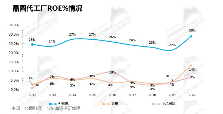 除自我输血能力外,投资人同样也关注净资产回报率的情况。对比各晶圆代工厂的 ROE% 水平,台积电又是妥妥的独一档。在过去十余年间,台积电的净资产回报率长期维持在 20% 以上。