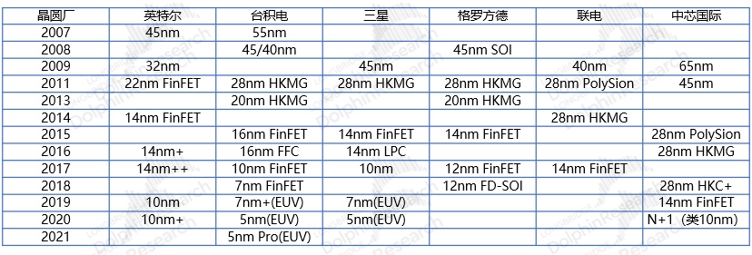 追赶者们,终于等到了超越的机会。英特尔在率先突破 14nm 节点后,在 10nm 制程节点上出现了持续难产的情况(英特尔首先开始 10nm 的研发,原计划是在 2016 年量产,由于当时 EUV 还不成熟,因此英特尔选择了多重四图案曝光(SAQP)技术,但研发过程中遭遇困难,导致 10nm 量产时间一再推迟)。而反观,台积电在 2017 年首先突破了 10nm FinFET 工艺,从而在全球获得了技术领先。此后台积电一直保持技术领先优势,率先突破 7nm 和 5nm 节点的制程工艺,进一步拉开了和英特尔之间的差距。