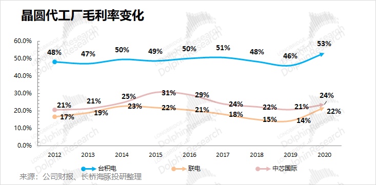结合台积电在晶圆代工行业中 50% 以上的收入份额来看,台积电又有绝对领先的毛利率优势,实质上台积电是赚了晶圆代工行业中绝大部分的利润。