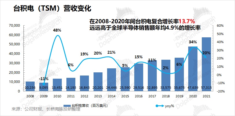 这从台积电过去十余年的发展中,也能初见端倪。在 2008-2020 年间,台积电营业收入的复合增长率达到 13.7%,远高于同期全球半导体销售额年均 4.9% 的增长。增速上的长时间领跑,一步步提升了台积电的行业地位。