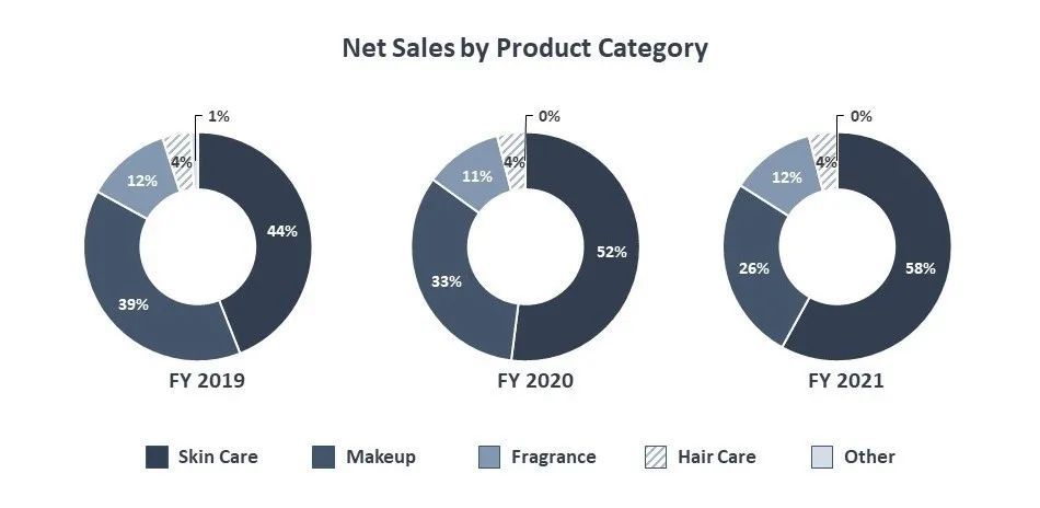 2021 年净销售额 16.215 亿相较 2020 年的 14.294 亿增长了 1.921 亿,净销售额增加,主要是由于护肤品、香水和护发产品的净销售额增加。在 2021 年,大约 58% 的营收来自护肤产品,这比 2019 年 44% 的护肤收入有了显著增长。相比之下,化妆品在销售额中的占比从 39% 下降到 26%,而香水产品的占比则保持在 12% 左右。护发产品占销售额的 4%,其余的都是其他产品。