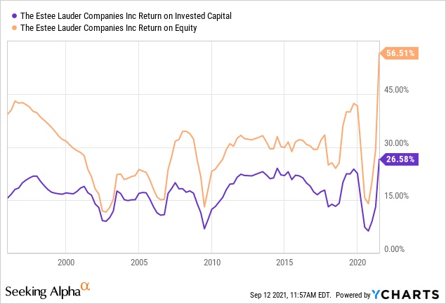 雅诗兰黛拥有非常强大的品牌和分销渠道优势,使其获得非常高的股本回报率和投资回报率股价