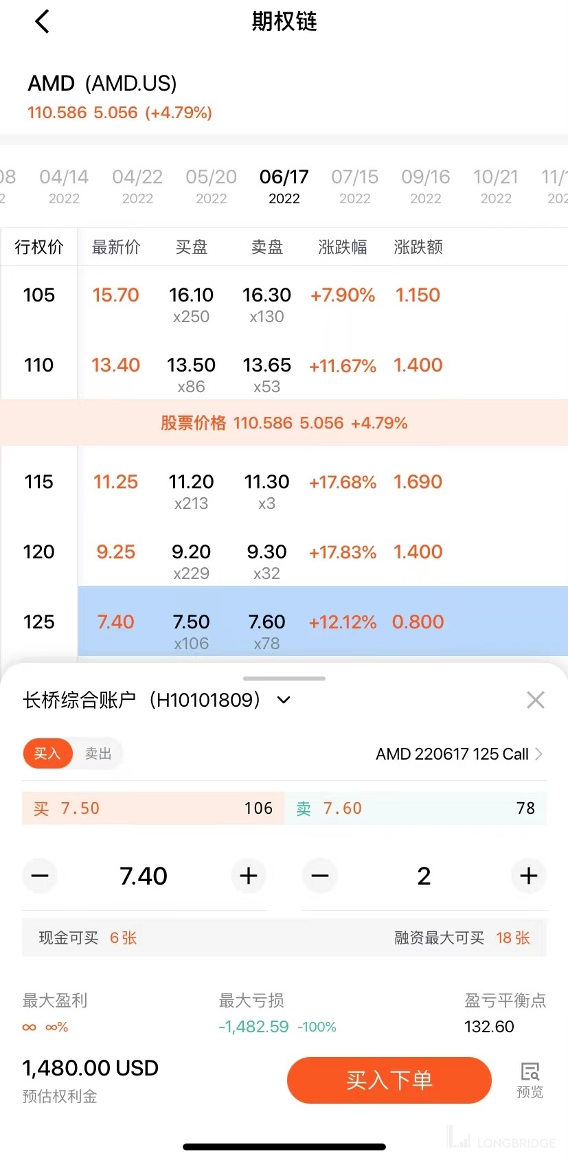 备兑开仓简单来说是当持有正股时,用比较小的代价买入期权做多空对冲,可以做多正股,买入同价位的 put 对冲,反之也可以做空正股,买入 call 对冲。如果持有正股多仓,股价上涨,最坏情况是损失 put 的全部期权金,但如果正股下跌,则 put 的涨幅,或者到期后行权可以减少正股仓位的损失。买入 call 对冲正股空头的情况相同。我上面的情况就属于之前卖空了 AMD 的正股,以买入 call 来对冲。但我多了一分私心,不想白白损失期权金,所以买的是超长 call,希望行情转暖以后靠这些 call 也能小赚一笔。作为备兑开仓来说是不太纯粹的一笔交易,大家不必参考。