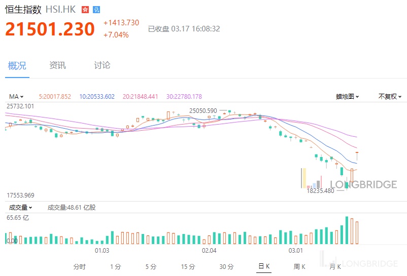 港股方面,$Hang Seng Index(00HSI.HK) 最近一周出现史诗级表现,从连续三周暴跌超 20%,到两天内暴涨 16% 收复部分失地,如此大幅度暴涨暴跌,实在很难想象出自于一个成熟金融市场的大型综合指数。当前面对恒指应该比面对美股更冷静。美股几大利空靴子先后落地,接下来需要面对的是通胀和经济衰退的可能性。而港股面对的形势更复杂,疫情扰乱,况且散户在港股市场占很大比重,情绪化严重,助涨助跌,并且很容易跌过头涨过头,如果不能始终保持清醒的话,很容易在单边市里因为选错方向反复割肉而损失惨重。