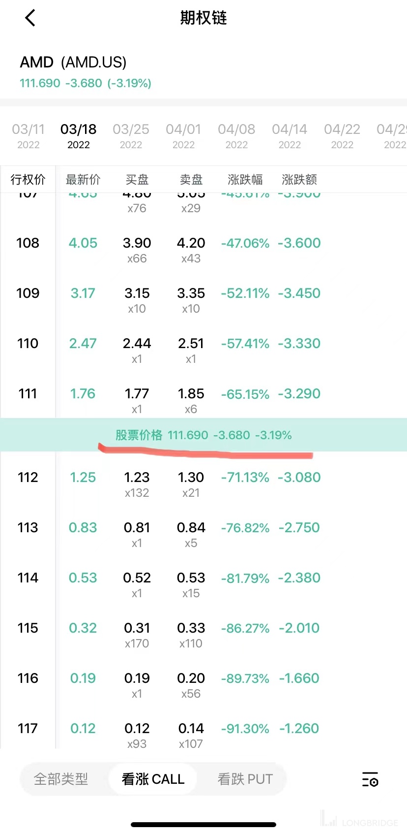 长桥期权交易的界面延续了其一贯简约直观的风格,在手机 APP 的正股行情界面,可以在底部找到 “期权” 的界面入口(前提是该股有期权可以交易),点进去以后是 “期权链” 界面,可以直观看到行权价、现价、买卖盘、涨跌幅等基本信息,底部还可以选择 call 或者 put。比较重要的是中间的绿色色块,标注了正股当前的股价,可以对照行权价参考。