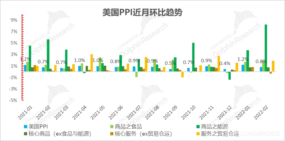 不过好在,海豚君注意到美国最近发布的 2 月 PPI 数据中,可以看到食品能源类 PPI 依然在飙涨中,而服务分项,剔除掉贸易仓运的 PPI 环比已小幅转负,明显低于市场预期,缓解了市场对加息的焦虑情绪。