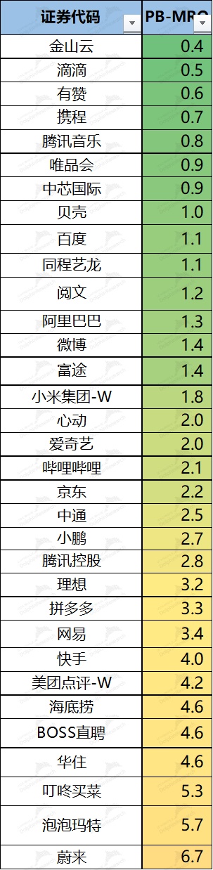 看 3 月 15 日收盘后市场给一些核心中概资产的定价:作为轻资产商业模式,很多互联网公司,比如腾讯音乐、携程、贝壳,甚至百度等都在破净线上徘徊。