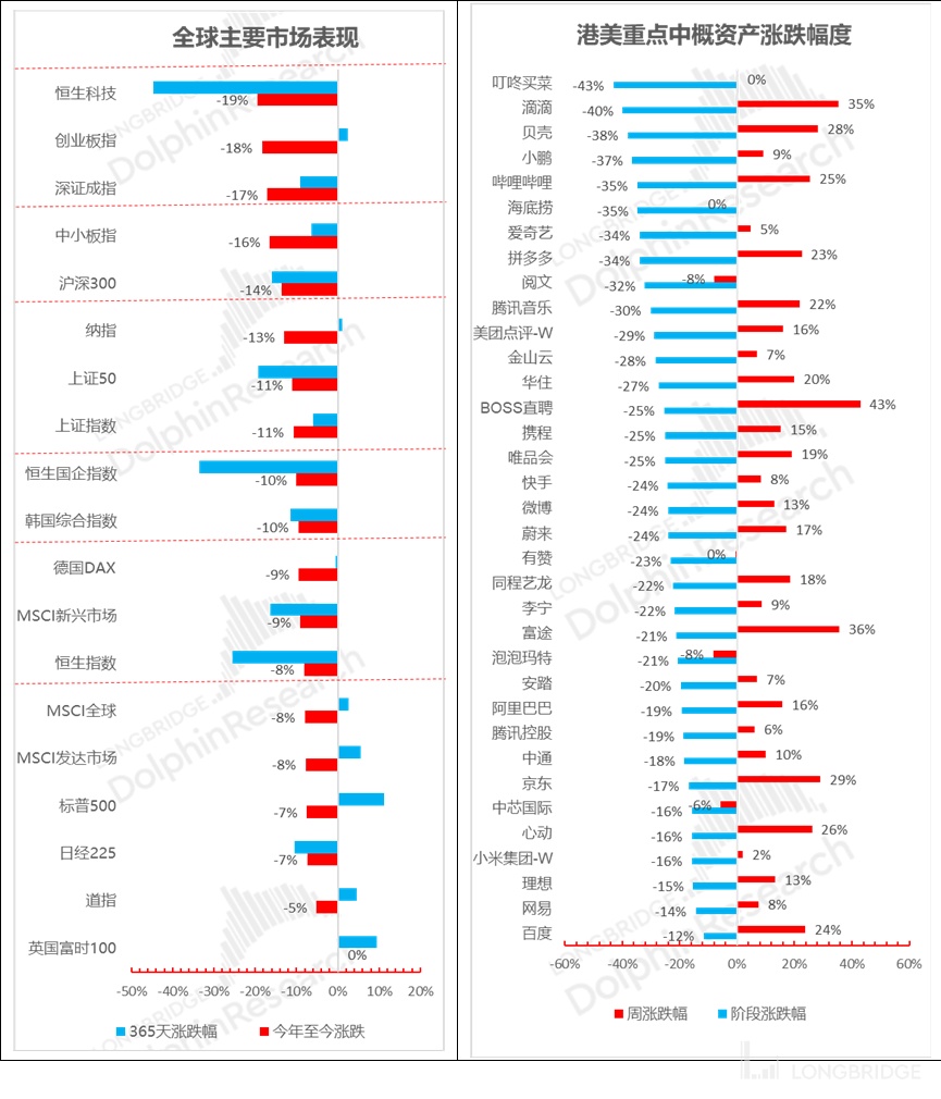下面这张图,是从刚过完元宵不久的 2 月 18 日(也就是发改委发文引导外卖平台下调费率)开始,到 3 月 17 日(昨天,也就是国家金融部门出面维稳市场之后一天),海豚君所关注的主要中概资产和对应全球主要市场的表现情况: