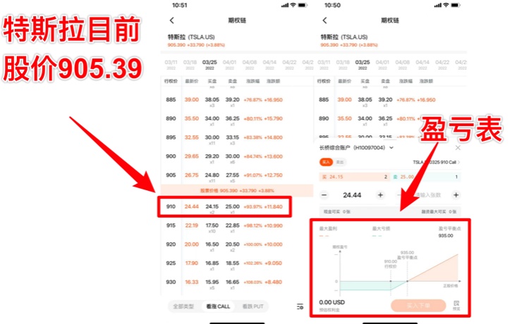 该期权合约,倘若我们现在买入,那么在 2022 年 3 月 25 日,特斯拉股价只有达到 910+24.44=934.44 美元至少是保本,只有超过 935 美元才有的赚。其实在长桥进行期权交易,可以很清楚的看到盈亏点,目前在其他证券还未看到,这是一个比较不错的设计,给产品经理点赞!
