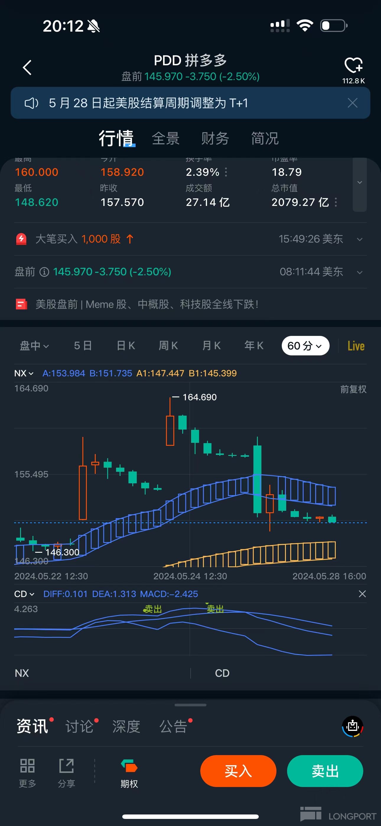 Last night’s analysis video was very clear: we bought Pinduoduo on April 19. Now, it’s time to sell. The CD indicator signaled a sell, and it broke below the blue ladder: