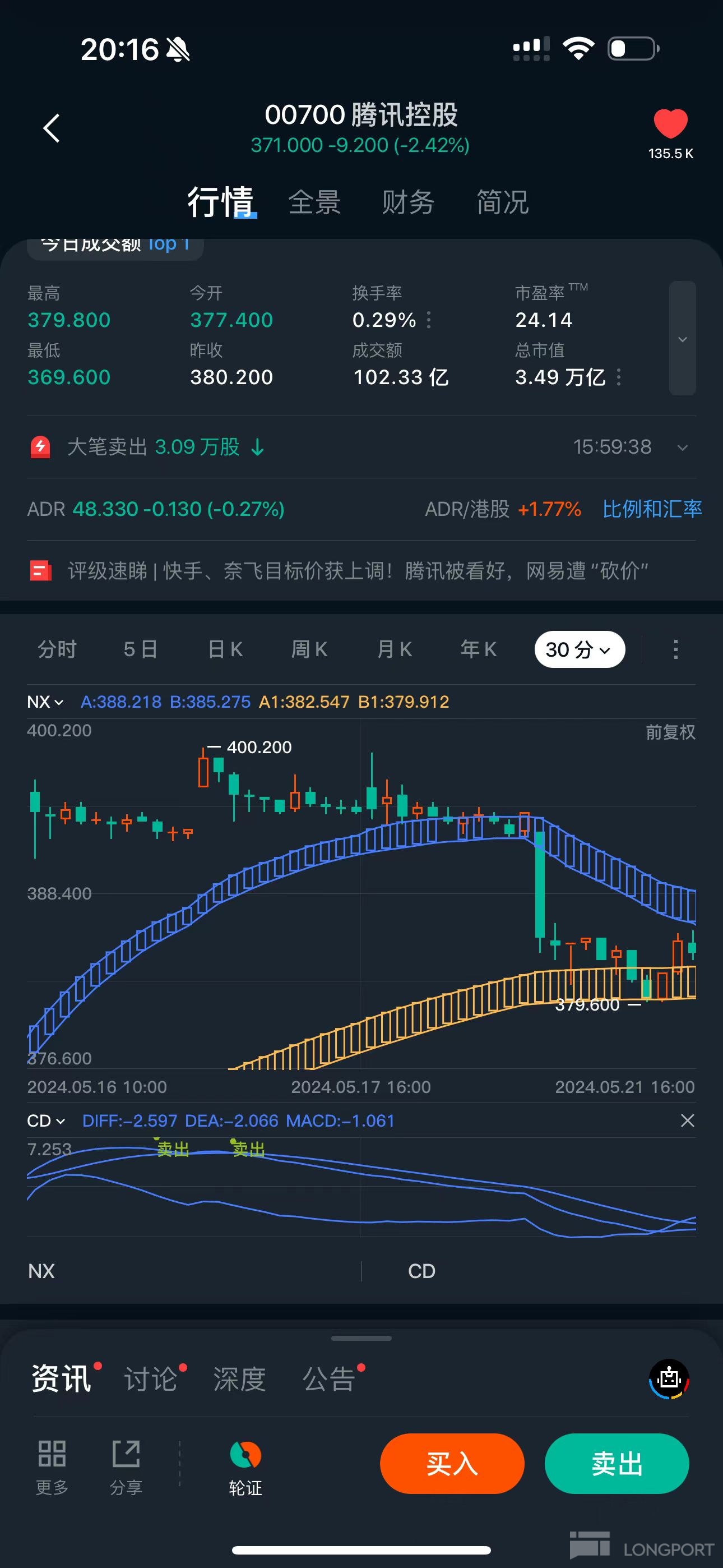Tencent also had a sell signal. The CD indicator at around 400 HKD suggested we consider selling Tencent.