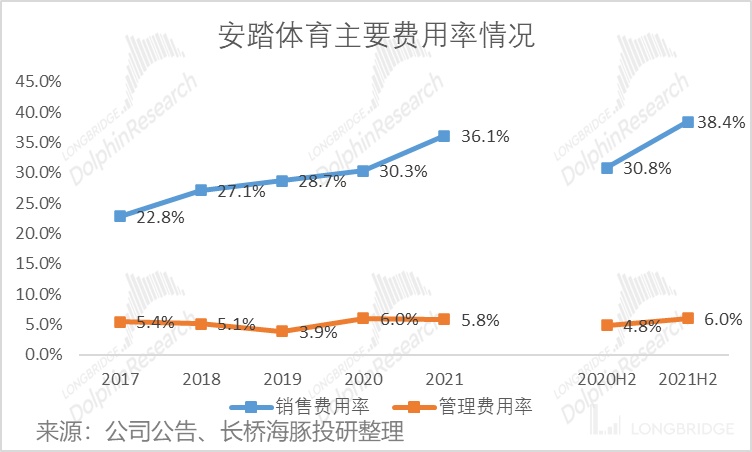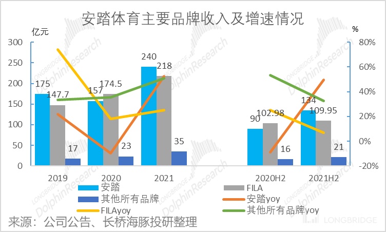 值得关注的是 FILA 2021 年下半年的断崖式下跌,从 2021 年上半年的 51% 增速下落至 2021 年下半年的 6.8%,从而拉低了 FILA 全年的增速,这也是安踏下半年以来股价跌跌不休的缘故。