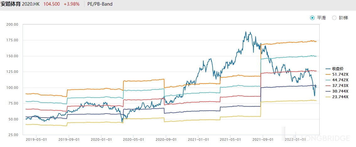 安踏虽然靠收购洋品牌、转型上市、牵手奥运,俨然已经是一家大公司的代表,但依旧还需要修炼内功,以确保 FILA 及其他新并购品牌不失速掉队,2022 年预计维持在 30X~35X 左右,3 月以来的港股流动性危机曾下探至最低 26 倍,随着市场开始逐步趋于稳定,从中长期投资角度来看价值仍有上升空间。