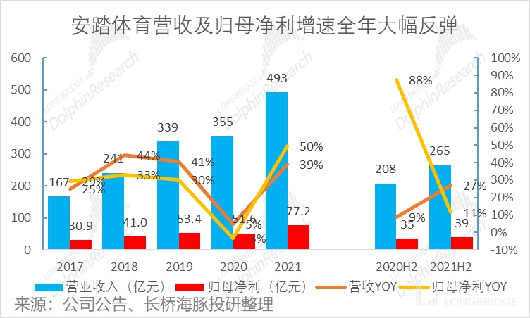 1、2021 年全年实现营收 493.28 亿元,同比增长 38.9%,归母净利润(含亚玛芬 AMER 亏损)77.2 亿元,同比增长 49.6%,略超此前的业绩预告;