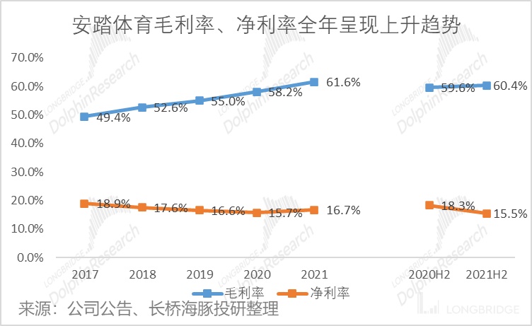 分品牌来看,安踏、FILA 收入占比分别为 48.7%、44.2%,其他品牌占比 7.1%。从收入增速来看,安踏、FILA、其他品牌分别同比增长 52.5%、25.1%、51.1%,安踏主品牌由于去年同期较低的基数,2021 年全年增速反弹明显,上、下半年增速未见明显差距。
