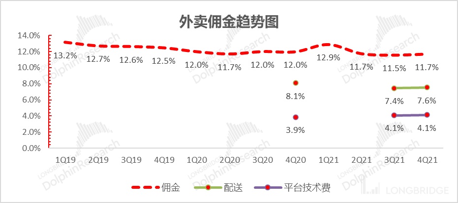 这个季度美团将原本的外卖佣金拆成了——配送服务费 + 佣金(海豚君这里统称平台技术服务费),另外原佣金中的部分收入,包括利息等,调到了外卖其他服务收入中。这样调整之后,市场能够非常清晰地看到外卖的变现构成: