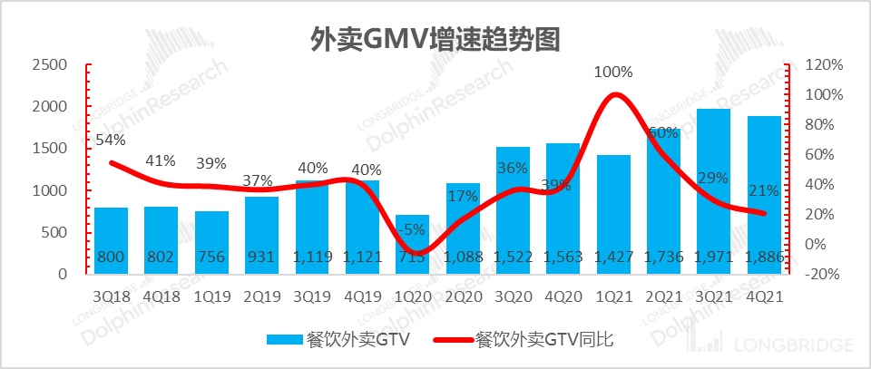 美团本季度外卖业务交易总额(GTV)为 1886 亿元,同比增长了 21%,算是稍稍超出了市场 19% 的预期;当然,就本身趋势而言,同比增长趋势是快速放缓的,当然这里也有疫情反复导致很多底线城市封锁小区,已经当前整体消费低迷有关。