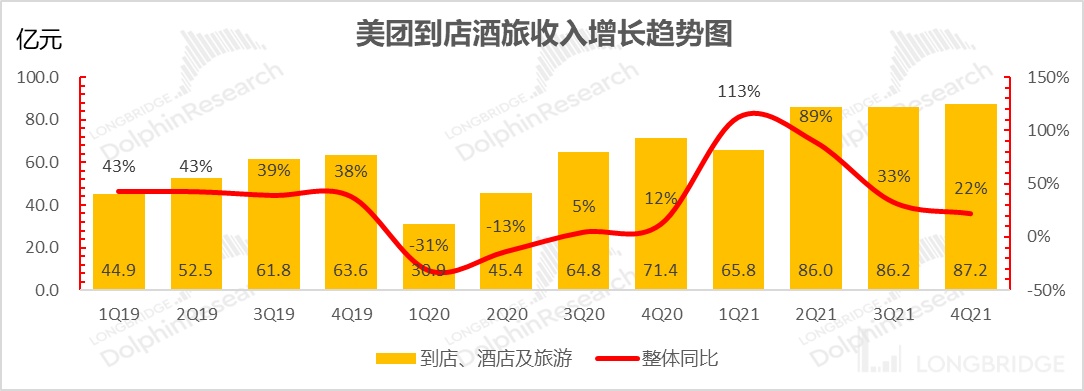 这个季度到店酒旅业务收入一共实现了 87 亿,同比增长 22%,与市场预期 88 亿基本一致。具体来看: