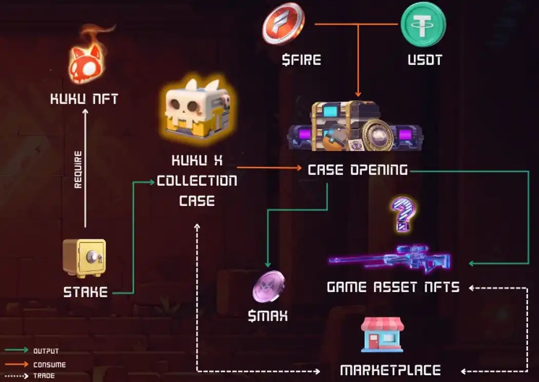Opening loot boxes requires spending $FIRE plus a small amount of stablecoins (e.g., $USDT). This may be one of the best solutions Web3 games have for mitigating token inflation caused by growing player bases. Essentially, it randomizes income—loot boxes can yield common skins or ultra-rare ones like "knives" or "gloves." Players can choose whether to test their luck and maximize earnings by chasing rare NFT assets.