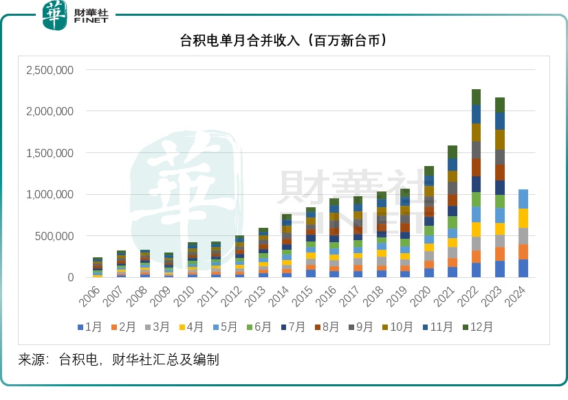 The H100 relies on TSMC's 5nm capacity, while NVIDIA's upgraded AI chips, the H200/B100, use TSMC's 4nm and 3nm processes, causing TSMC's capacity to fill up rapidly. As shown below, TSMC's revenue has surged significantly over the past two years.