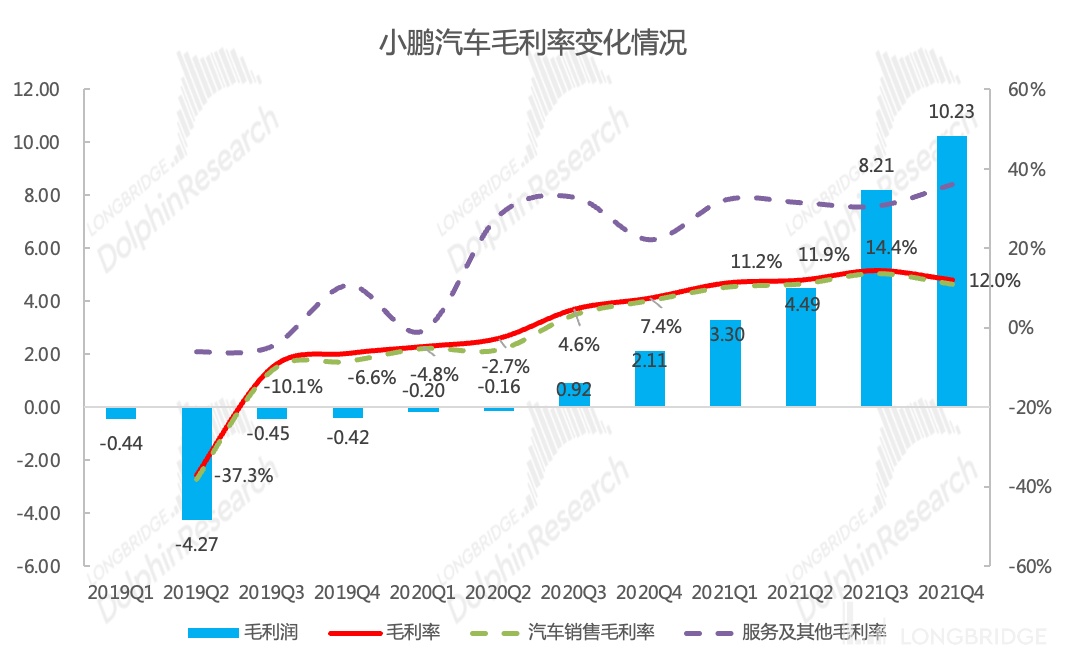 小鹏汽车业务结构简单,整体毛利率取决于汽车销售毛利率。2021 年四季度小鹏汽车整体毛利率 12%,环比三季度的 14.4% 降低 2.4 个 pct,略低于彭博一致预期 12.6%。