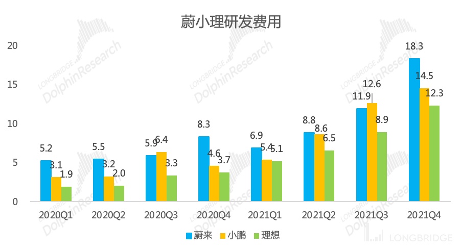 同时和蔚来、理想相比,小鹏的战略选择是最需要在研发上烧钱的,小鹏汽车给自己定义的两个标签分别是做更懂中国的智能车和全栈自研,同时小鹏一心要把销量做上去的战略选择,证明公司后期软件变现的决心和信心,因此也必然要求小鹏前置大量的研发投入,厚积薄发。