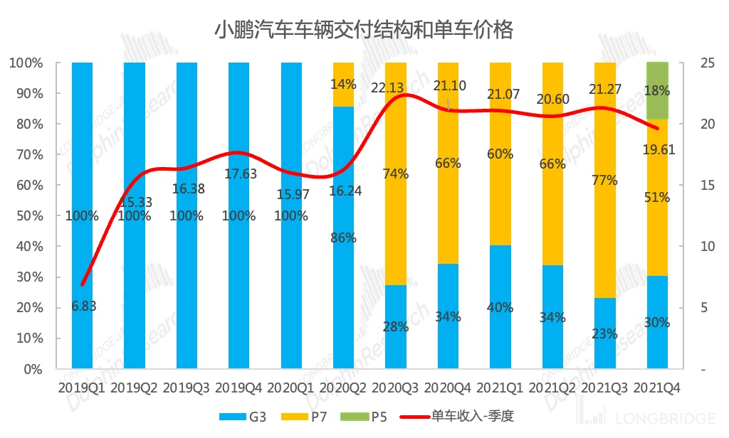 2、汽车业务量增价降。在交付量是明牌的基础上,公司汽车销售收入超出预期,预期差来自于 ASP 下滑幅度好于市场预期。公司四季度开始交付定价偏低的 P5 新车型,销量占比达到 18%,定位更高的 P7 销量占比则降低至 51%。展望 2022 年,指引暗含一季度 ASP 可能会小幅拉升,三季度 G9 的交付将再度拉升公司 ASP。