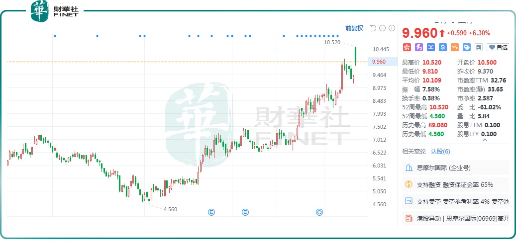 On June 24, the leading e-cigarette company $SMOORE INTL(06969.HK) surged over 12% at the opening with heavy trading volume, hitting a high of HKD 10.52, the highest level since April 2023. As of press time, the company's stock was up 6.3% at HKD 9.96 per share, with a market capitalization of HKD 61.153 billion.