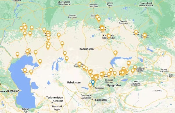 Location map of 143 gas stations where Deltrix cooperates with CNPC to operate EV charging stations across Kazakhstan