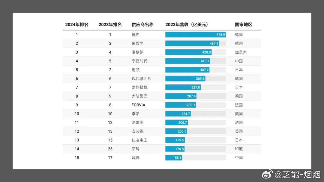 The 2024 global top auto parts suppliers ranking shows that the revenue of auto parts manufacturers increased by an average of 9% year-on-year, mainly due to the recovery of the global economic supply chain and the expansion of the electric vehicle market.
