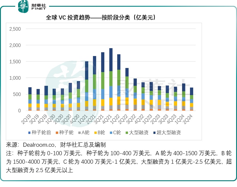 According to the latest data from Dealroom.co, a global startup and tech company data provider, venture capital investment in Q2 2024 amounted to $70.5 billion, down 14.86% quarter-on-quarter and 6.13% year-on-year. However, large-scale investment deals exceeding $250 million surged by 89.34% year-on-year, offsetting most of the negative impact from the quarterly decline in funding from seed to Series C rounds. See the chart below.