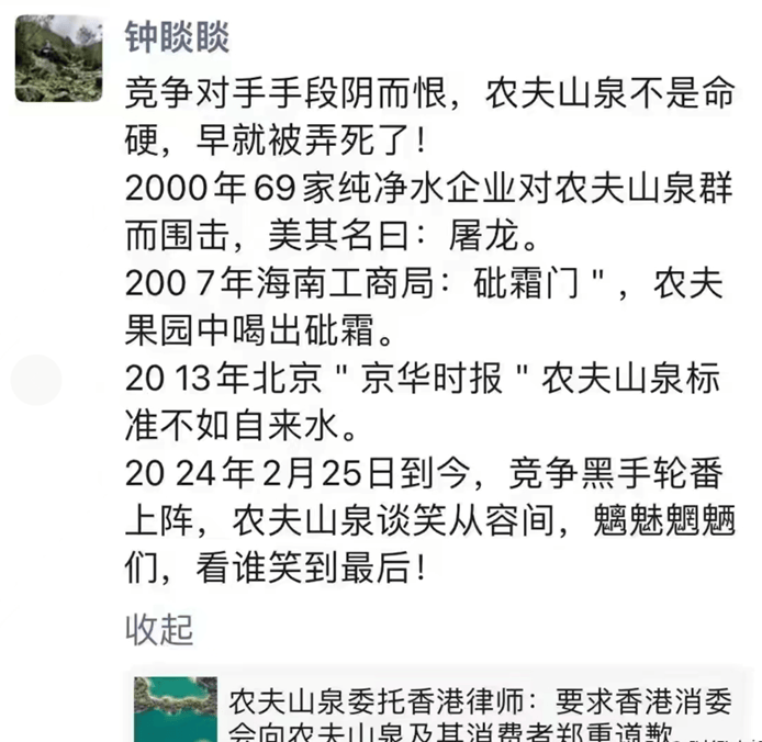 Hong Kong Consumer Council hinted that Nongfu Spring may cause cancer, Zhong Shanshan responded in WeChat Moments: The opponent is sinister and ruthless.