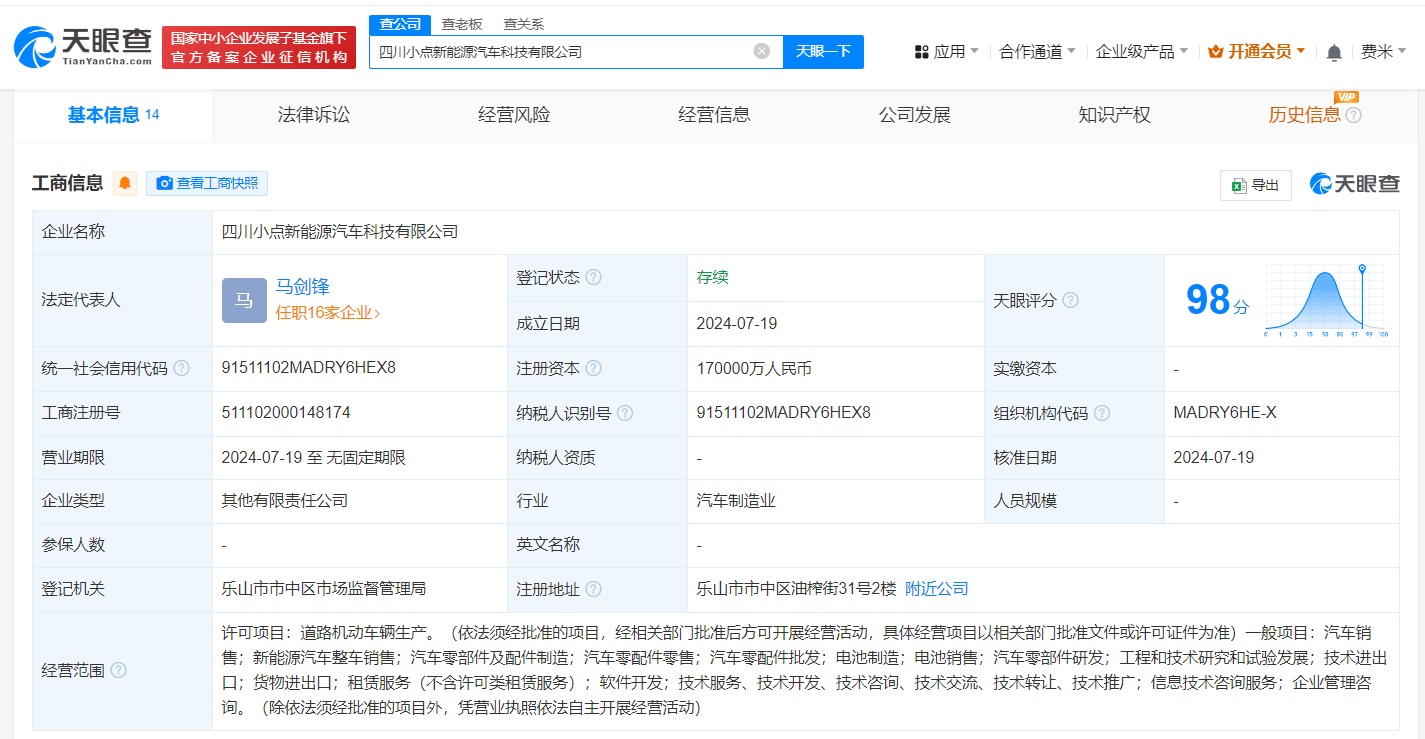 According to US Stock Research Society, Tianyancha App shows that Sichuan Xiaodian New Energy Vehicle Technology Co., Ltd. was recently established, with Ma Jianfeng as the legal representative and a registered capital of 1.7 billion RMB. Its business scope includes sales of new energy vehicles, manufacturing of automotive parts and components, retail and wholesale of automotive parts, battery manufacturing, and battery sales. Shareholder information indicates that the company is jointly held by Hunan Zhidian Intelligent New Energy Vehicle Co., Ltd., its subsidiary Shanghai Xiaodian Automotive Technology Co., Ltd., Leshan State-owned Assets Investment and Operation (Group) Co., Ltd., and Leshan Xingjia Investment Development (Group) Co., Ltd.
