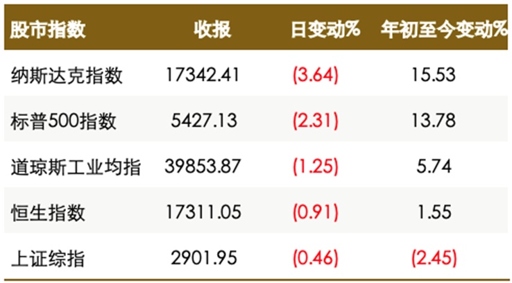l The S&P 500 Index recorded its largest single-day drop in a year and a half. Goldman Sachs' trading desk advised systematic funds to sell U.S. stocks. Meanwhile, volatility has been rising, with Wall Street's fear gauge VIX surging 14% on Wednesday.