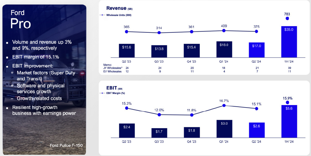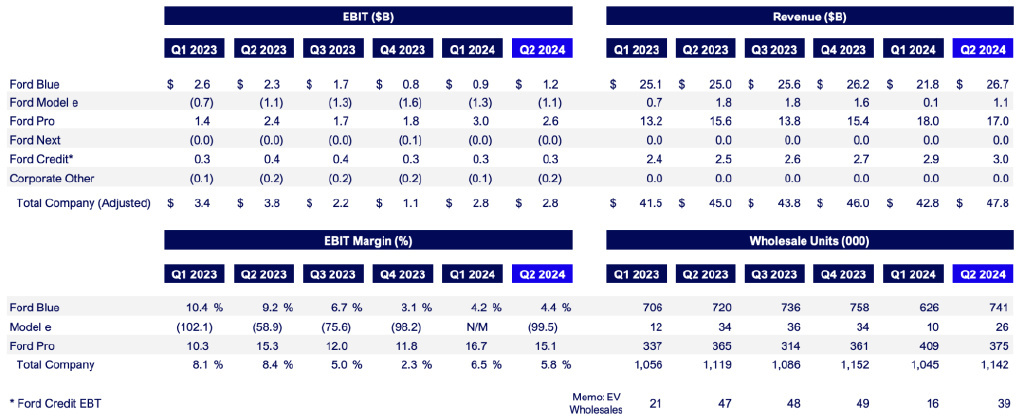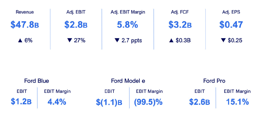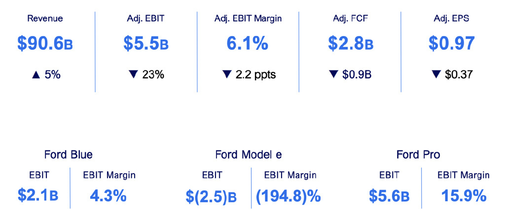 电动汽车部门亏损了 25 亿美元。整体收入为 906 亿美元,同比增长 5%;调整后的 EBIT 为 55 亿美元,EBIT 利润率为 6.1%,调整后的 EPS 为 0.97 美元。福特 Blue、福特 Model e 和福特 Pro 的 EBIT 分别为 21 亿美元、-25 亿美元和 56 亿美元。