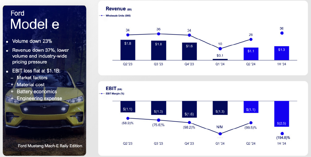 现在福特最大的窟窿就在电动汽车部门 Model e,从季度数据来看,销量下降了 23%,收入下降了 37%,EBIT 亏损持平在 11 亿美元。