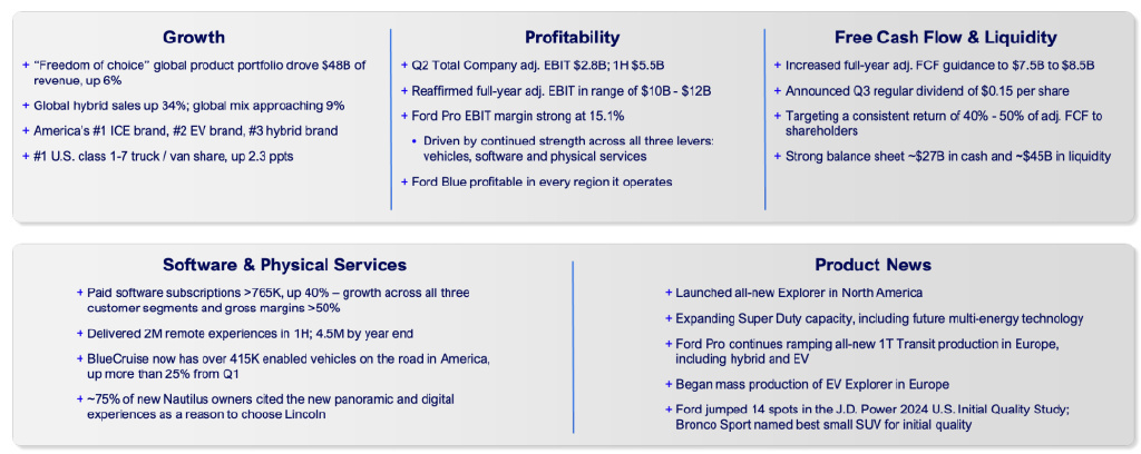 归根结底,公司的发展还是要看其盈利能力。福特各业务部门的财务状况总体良好,第二季度公司重申了全年调整后的 EBIT(息税前利润)将在 100 亿美元至 120 亿美元之间的预测。