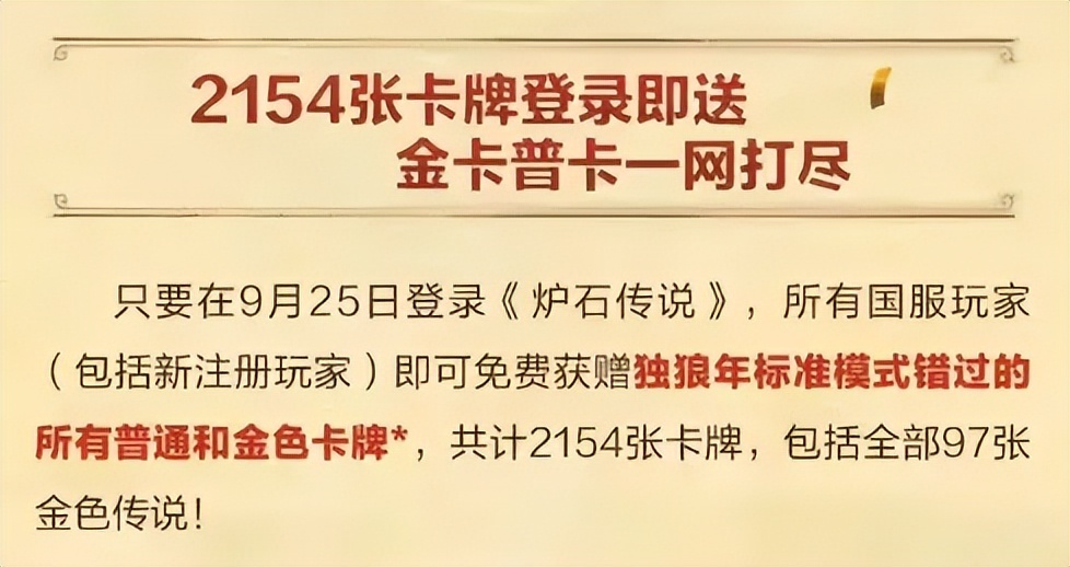 1. All Chinese players (including new registrants) who log into "Hearthstone" on September 25 will receive all missed standard and golden cards from the Year of the Wolf for free—a total of 2,154 cards, including all 97 golden legendaries.