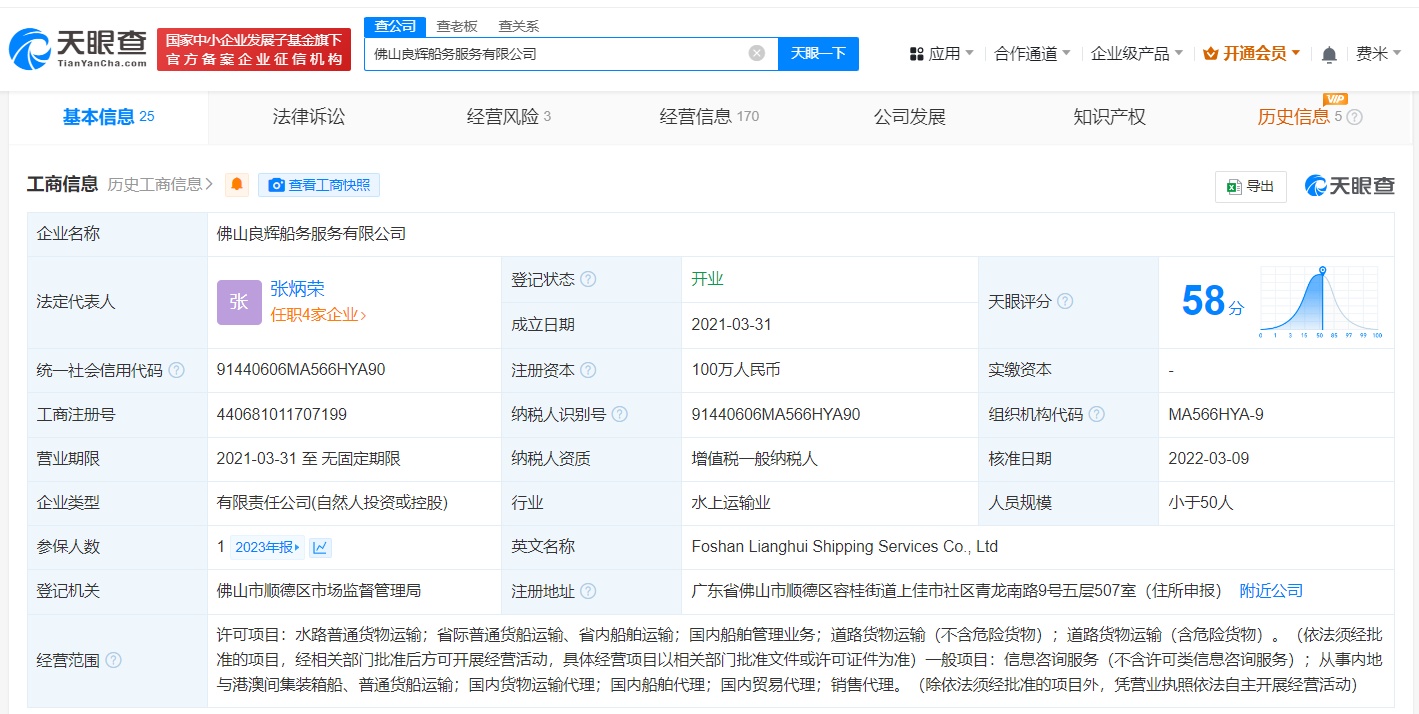 Foshan Lianghui Shipping Service Co., Ltd. was established in March 2021, with Zhang Bingrong as the legal representative and a registered capital of RMB 1 million, held by Zhang Bingrong and Lin Yunfen at 60% and 40% respectively. According to media reports, in February this year, the Foshan-registered container ship "Lianghui 688" collided with the Lixin Sha Bridge due to improper crew operation, causing the bridge deck to break and resulting in 5 fatalities.