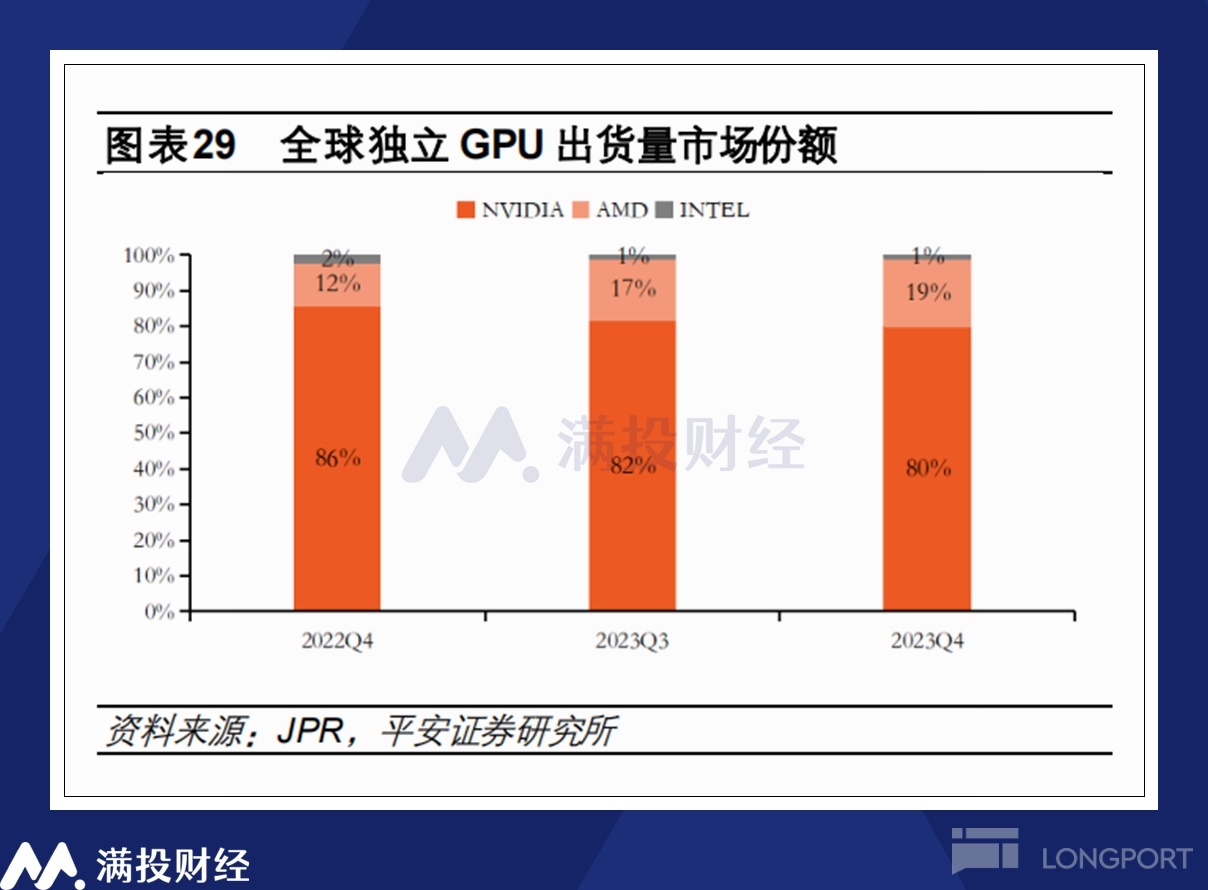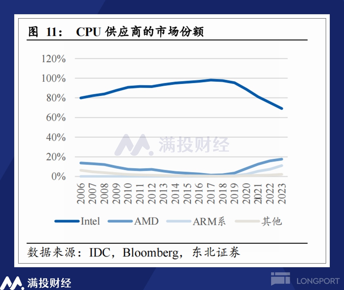 In CPUs, AMD is also the "industry second." By end-2023, Intel's share fell to 69% from 97%, while AMD rose to 17.6%.