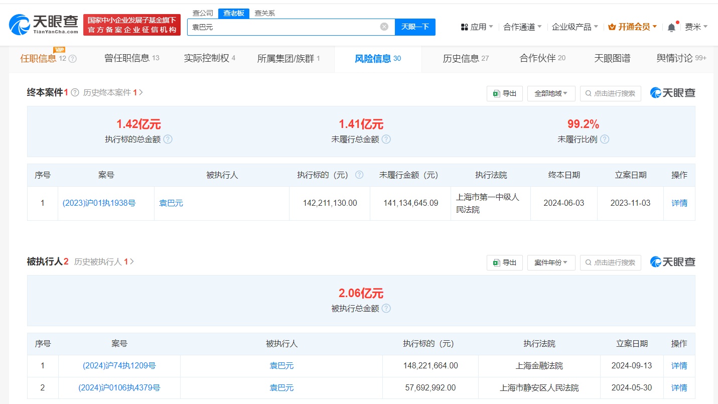 Tianyancha risk information shows that Yuan Bayuan currently has 2 enforcement records, with a total enforcement amount exceeding 200 million yuan. In addition, Yuan Bayuan is also associated with terminated cases with unpaid amounts exceeding 140 million yuan.