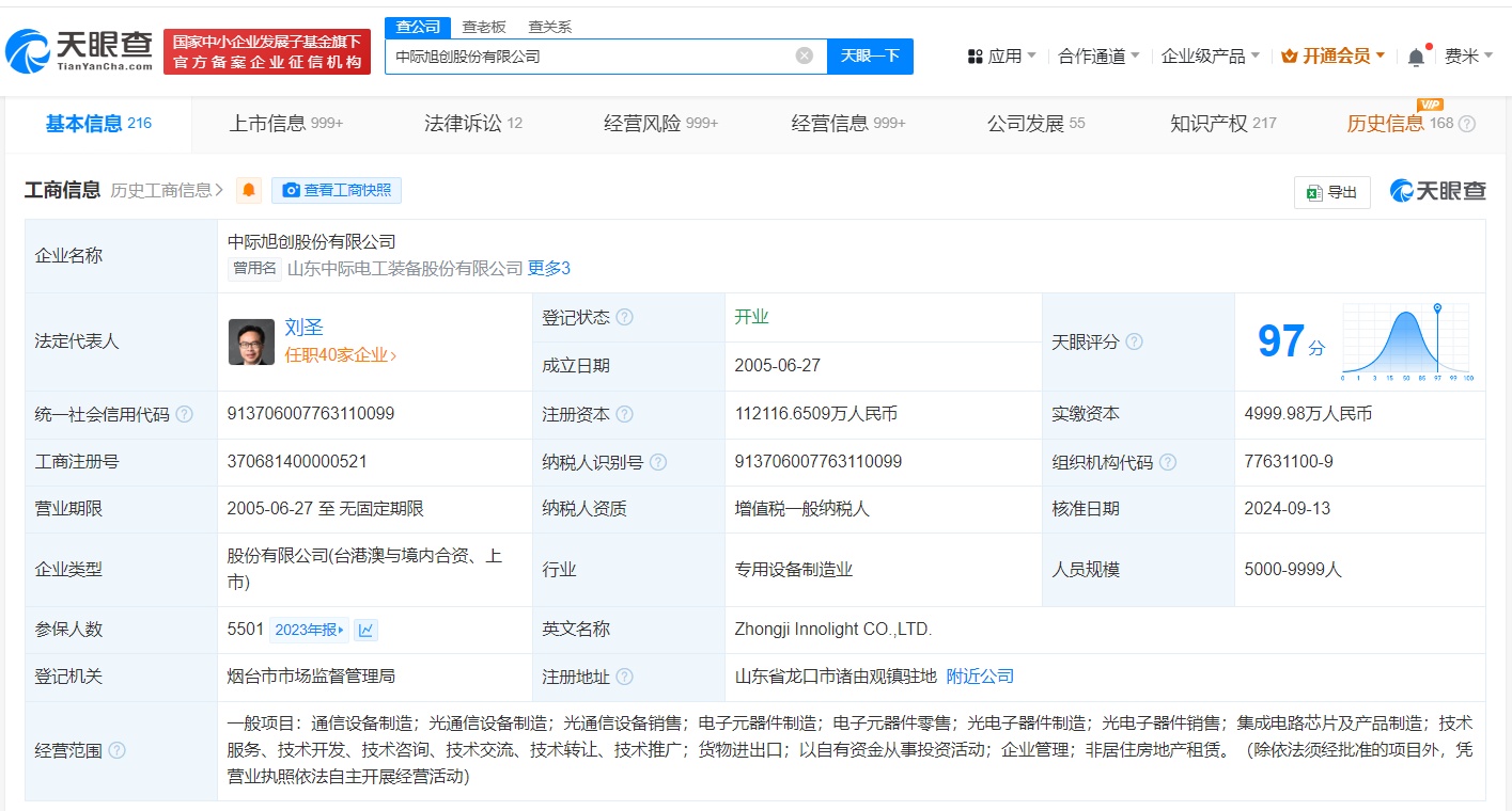According to US Stock Research, Tianyancha App shows that recently, InnoLight Technology (300308) underwent industrial and commercial changes, with its registered capital increasing from approximately 800 million RMB to about 1.12 billion RMB.