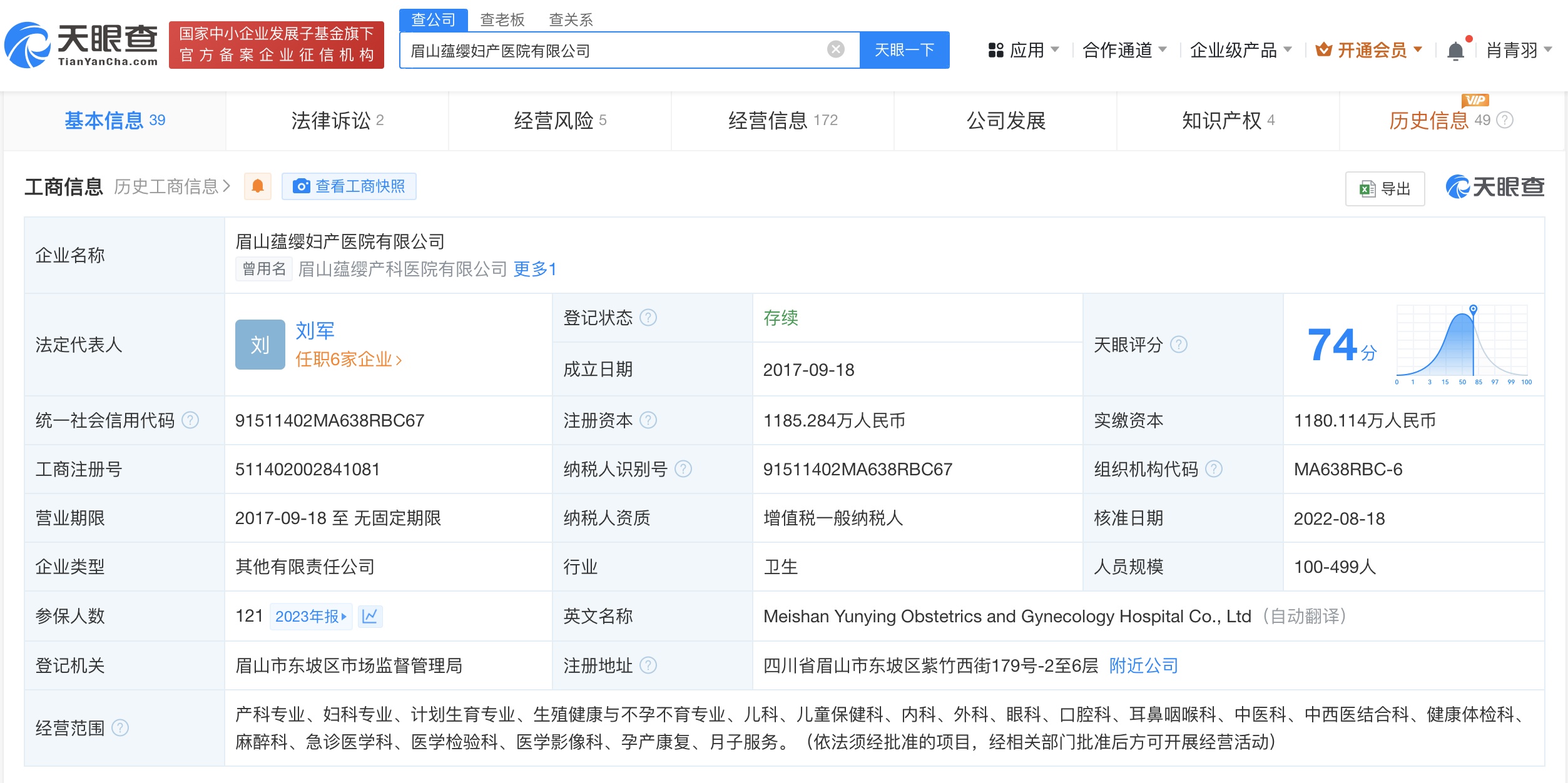 Tianyancha App shows that Meishan Yunying Maternity Hospital Co., Ltd. was established in September 2017, with Liu Jun as its legal representative and a registered capital of approximately 11.85 million RMB. Its business scope includes obstetrics, gynecology, family planning, reproductive health and infertility, postpartum rehabilitation, and maternity services. It is jointly held by Meishan Yunying Maternity Hospital (Limited Partnership) and Meishan Xinsheng'er Maternity Hospital (Limited Partnership). Risk information reveals that on September 7, the company was fined 38,000 RMB by the Meishan Dongpo District Health Bureau for failing to properly identify the identities of maternity patients, resulting in two surrogate mothers giving birth under false names. Previously, the company had been penalized multiple times for illegal advertising.