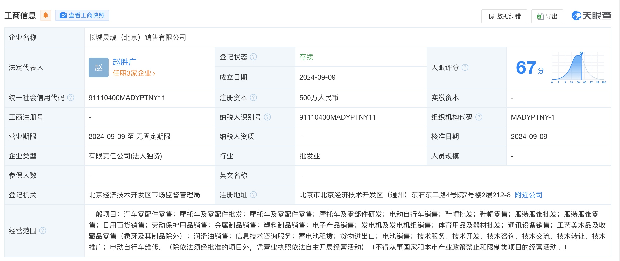 According to US Stock Research, Tianyancha App shows that recently, Great Wall SOUL (Beijing) Sales Co., Ltd. was established, with Zhao Shengguang as the legal representative and a registered capital of 5 million RMB. Its business scope includes retail of auto parts, wholesale of motorcycles and parts, R&D of motorcycles and components, and battery sales. Shareholder information indicates that the company is wholly owned by Great Wall SOUL Technology Co., Ltd., a subsidiary of Great Wall Motor (601633).