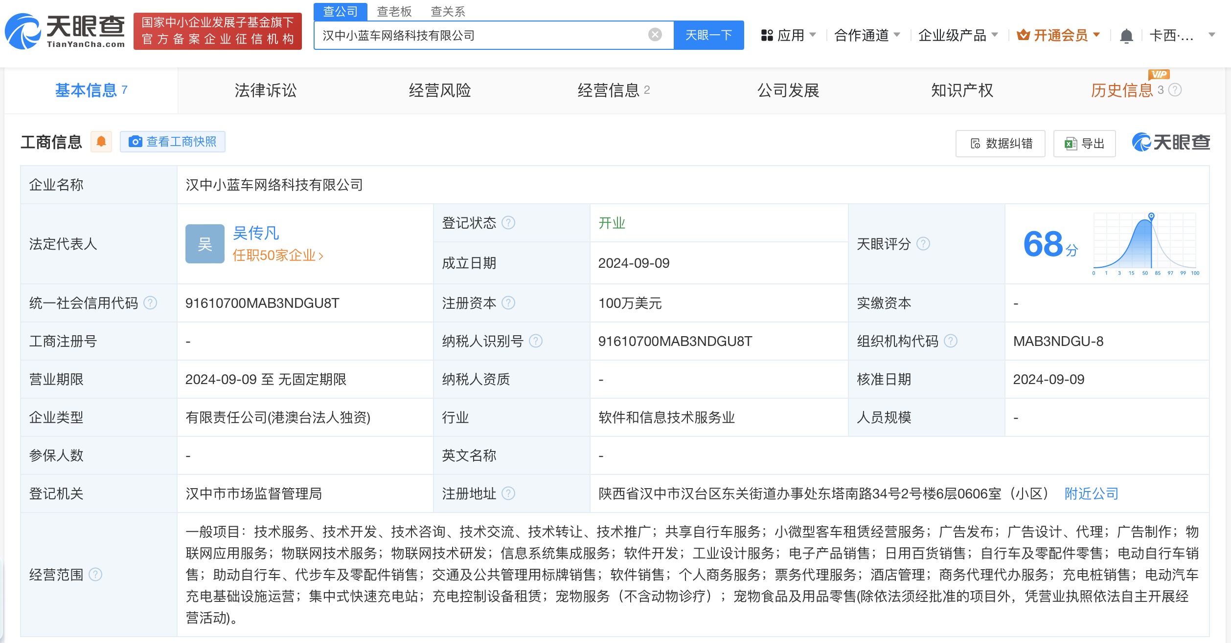 According to US Stock Research, Tianyancha App shows that recently, Hanzhong Little Blue Bike Network Technology Co., Ltd. was established, with Eddie Wu as the legal representative and a registered capital of $1 million. Its business scope includes shared bicycle services, small and micro passenger car rental services, and charging pile sales. Shareholder information shows that the company is wholly owned by Hong Kong RideTech Limited.