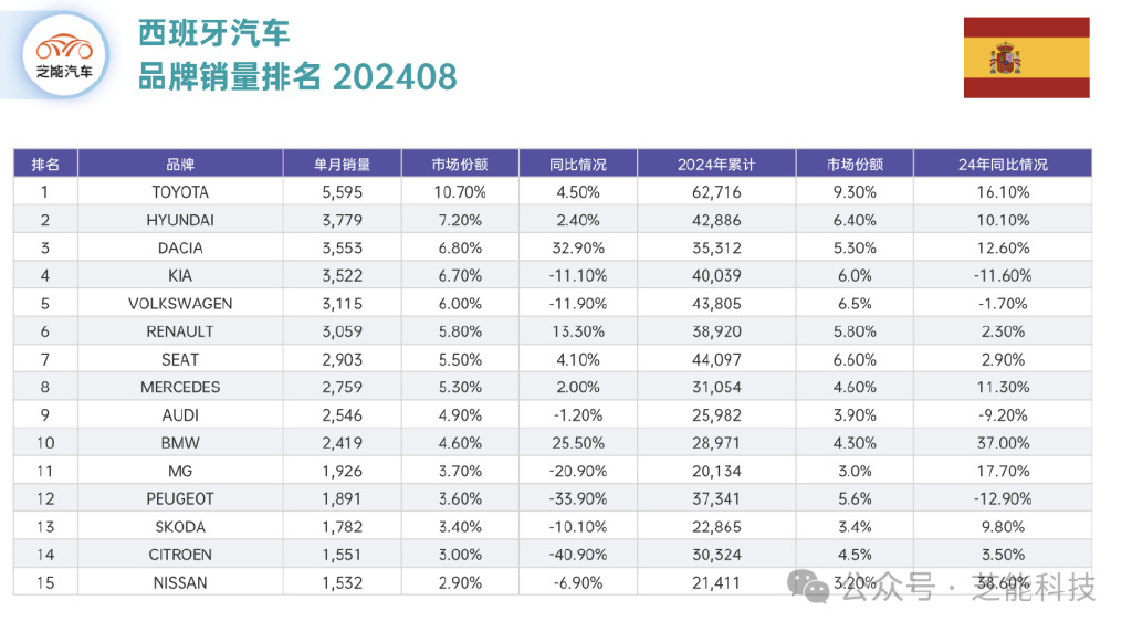 ◎ 丰田(+4.5%)在西班牙市场表现尤为突出,市场份额达到 10.7%。