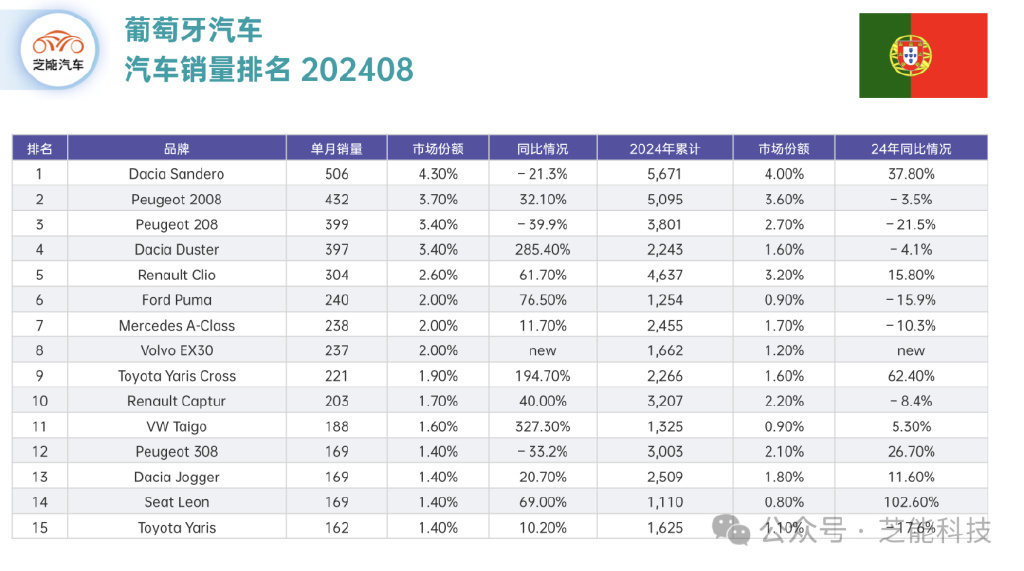 ● 葡萄牙的新车市场在 8 月份同比下降了 9.4%,销量降至 11,822 辆,年初至今的销量数据来看,市场整体仍呈现增长态势,同比增长 2.5%,达到 142,789 辆。