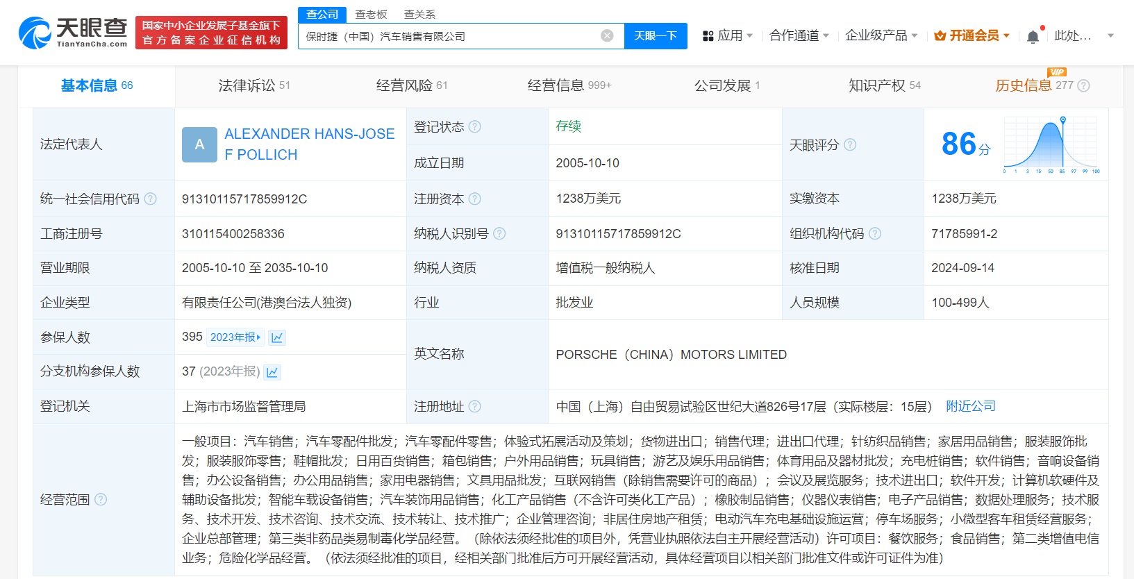 The company was established in October 2005 with a registered capital of $12.38 million. Its business scope includes automobile sales, wholesale and retail of auto parts, etc. It is wholly owned by Porsche Hong Kong Limited. According to media reports, on July 20, Porsche officially announced that Alexander Pollich will officially assume the position of President and CEO of Porsche China on September 1, 2024, overseeing the brand's business in mainland China, Hong Kong, and Macau.